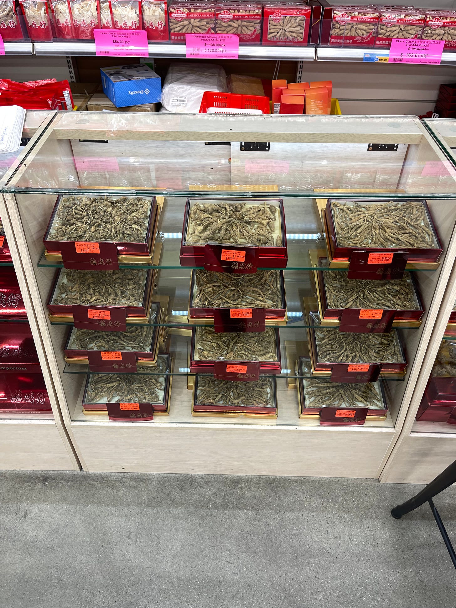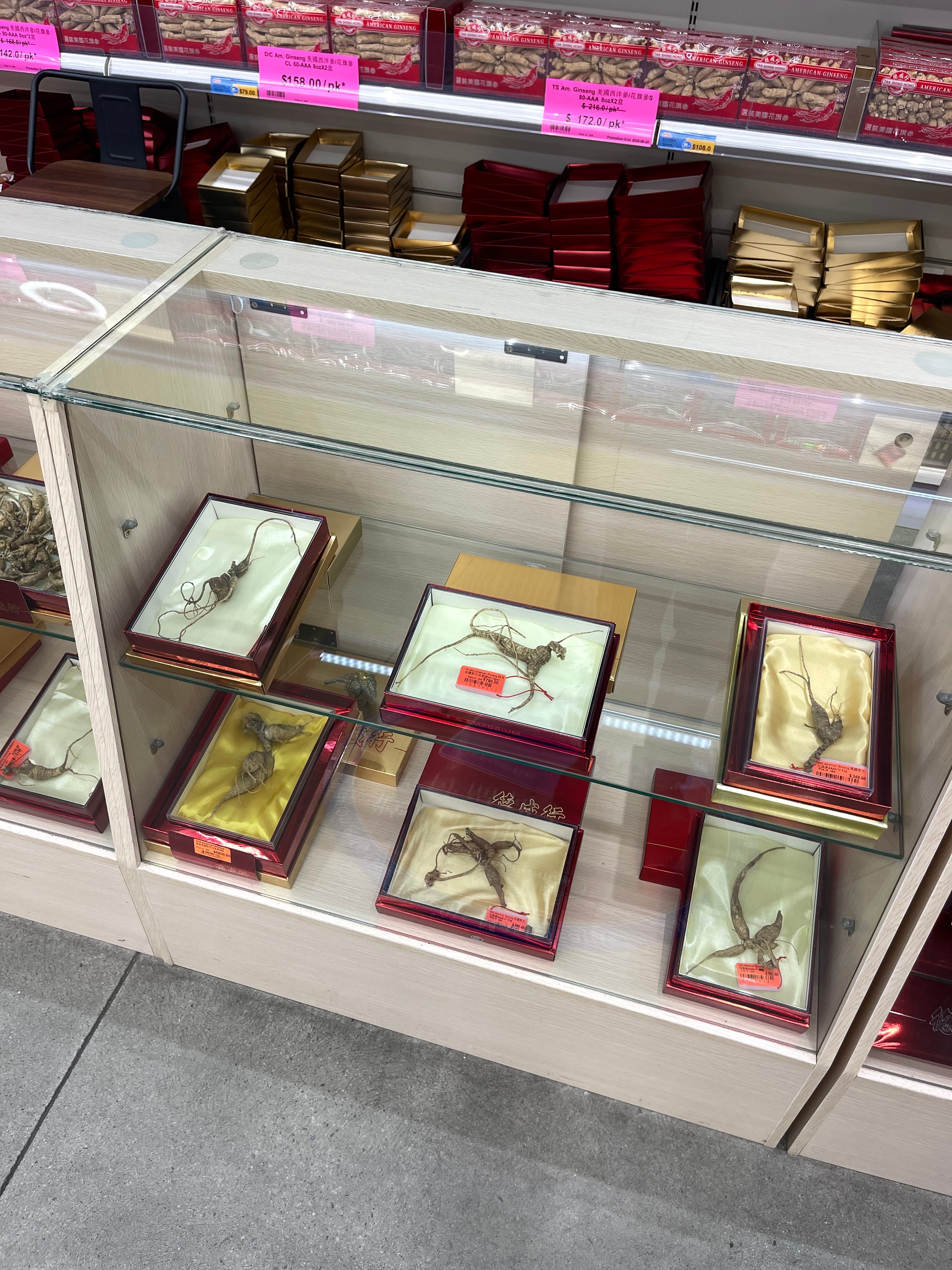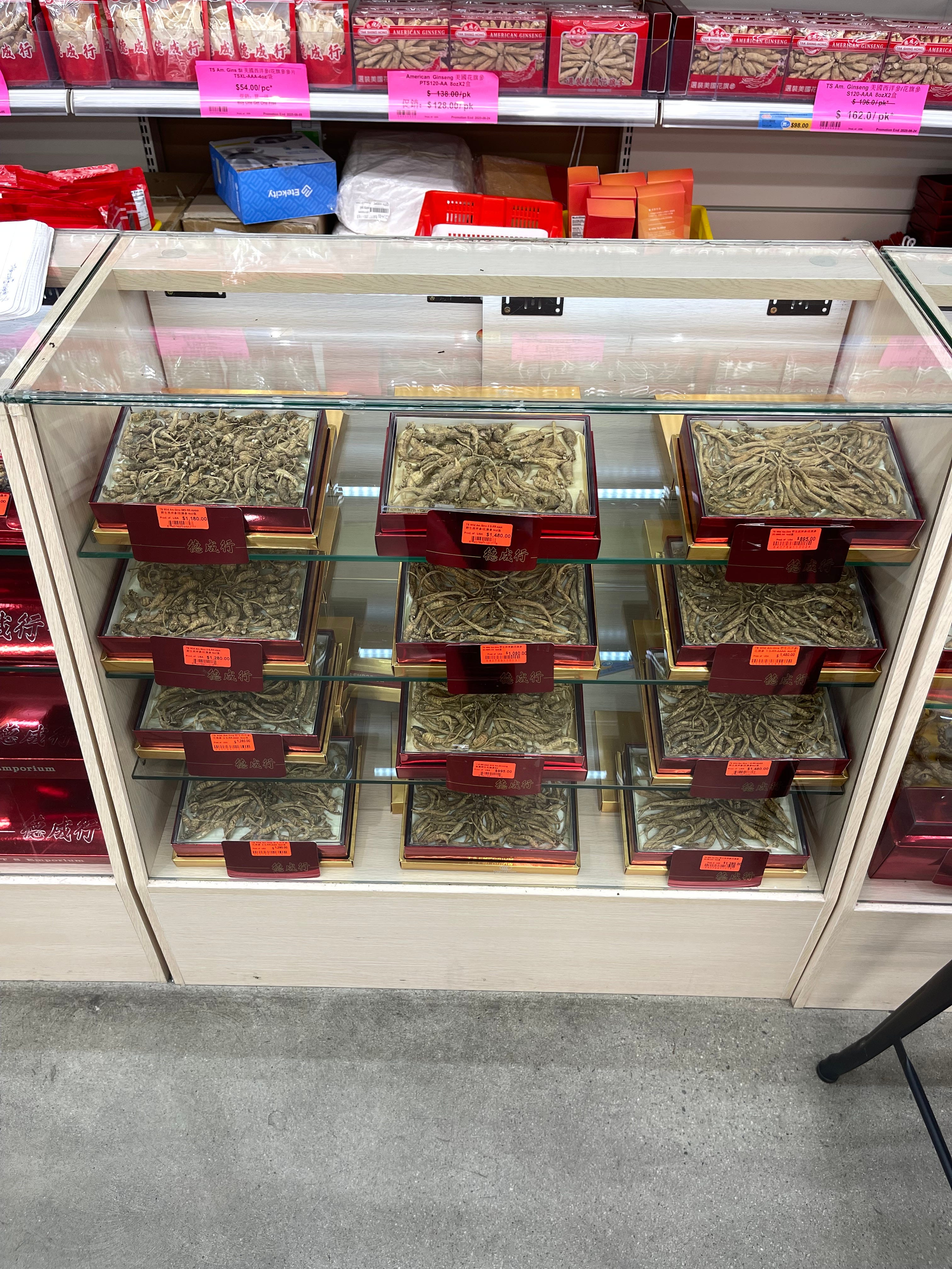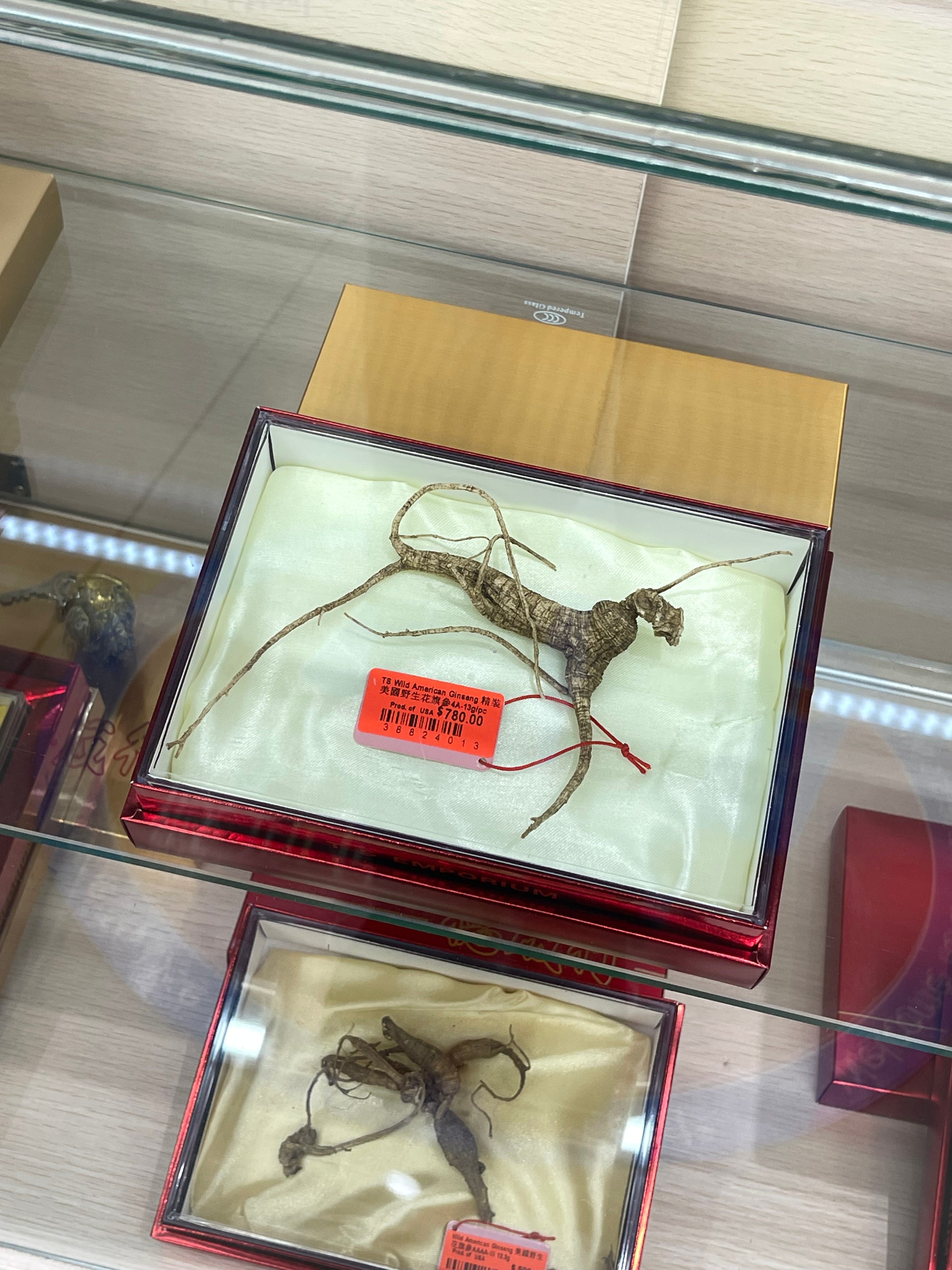 Greg took me to TS Emporium with little background, just an enthusiastic you’ve-got-to-check-this-out grin. He came across it while filming a video in which he followed a power line from Pasadena to Paramount. Upon entering the Rosemead Blvd location my mouth dropped in awe. A sprawling counter, like that of a luxury department store, filled with ginseng. Like tiny dancers performing something more contemporary than ballet, each root more expressive than the last; gnarled and winding, human but alien too. Limbs outstretched, framed by a creamy satin slip and the metallic red frame of an elegant box. I spy an ensemble dancing in tandem to my left with the price tag of $3,980, and a solo to my right; one piece of ginseng, dramatically unfurled for $780.