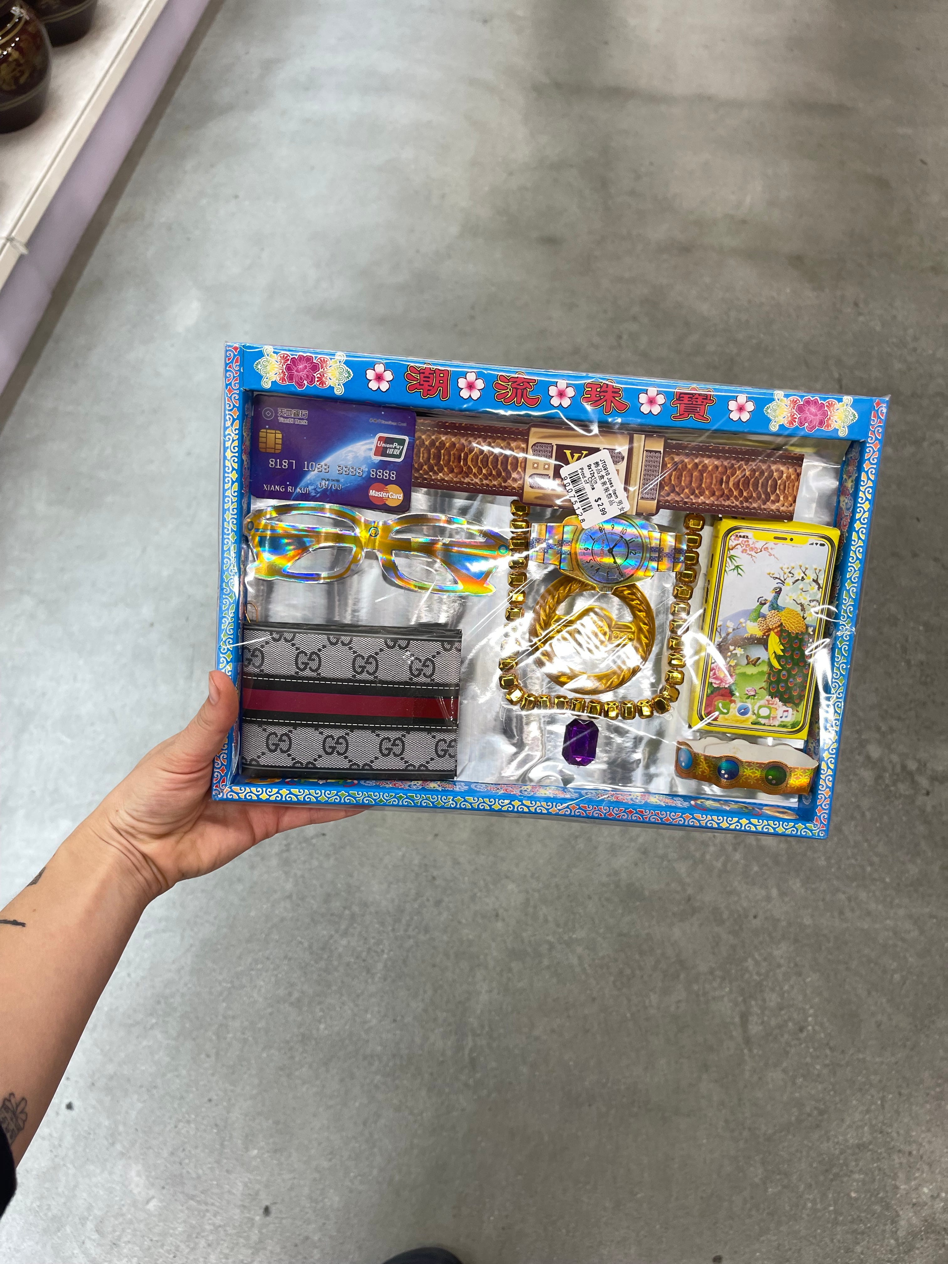 Near the slippers, half an aisle of Joss paper, items made to be burnt in ritual sacrifice to your ancestors so they may receive the item in the afterlife. Paper snakeskin loafers, Gucci wallets, iPhones, tweed suits, credit cards, and straight up cash designed in painstaking detail. I silently wonder if Joss paper vapes exist, and if so in what flavor.